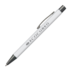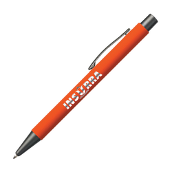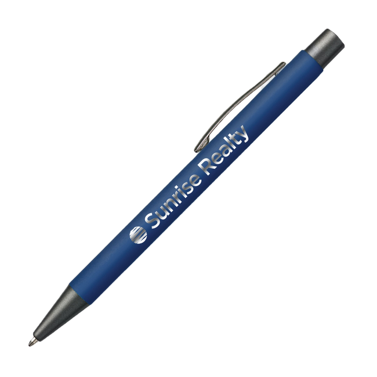 Kugelschreiber aus Aluminium mit samtigweicher Soft-Touch-Oberfläche, Großraummine mit blauer oder schwarzer Schreibfarbe und einer Schreibleistung von bis zu 2.000 Metern. Ihr Logo kann als silberfarbene Spiegelglanz-Lasergravur auf den Kugelschreibern platziert werden.